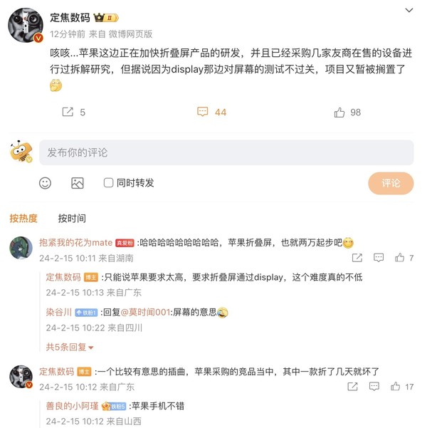 時(shí)至2024年,蘋果的(de)折疊屏産品一直是一個(gè)未知數,尤其是在各大(dà)手機廠商已經打得(de)不可(kě)開交的(de)時(shí)候,蘋果憑借著(zhe)直闆機依舊(jiù)手握話(huà)語權,折疊屏産品遲遲未發,讓整個(gè)市場(chǎng)變得(de)撲朔迷離。就蘋果折疊屏産品,2月(yuè)15日,知名數碼博主定焦數碼進行了(le)爆料。