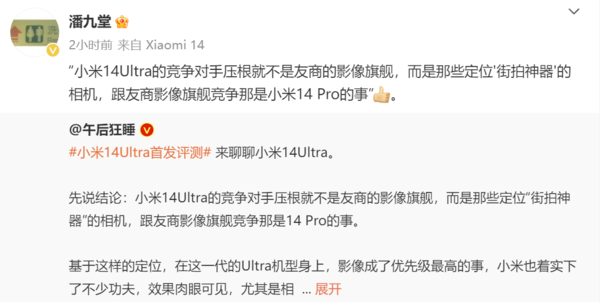2月(yuè)23日,小米集團高(gāo)管、小米産業投資部合夥人(rén)潘九堂在微博轉發了(le)其他(tā)科技博主使用(yòng)小米14 Ultra拍(pāi)攝的(de)照(zhào)片,潘九堂摘取了(le)該博主對(duì)于小米14 Ultra的(de)一段評價:小米14Ultra的(de)競争對(duì)手壓根就不是友商的(de)影(yǐng)像旗艦,而是那些定位“街(jiē)拍(pāi)神器”的(de)相機,同時(shí)點贊表達了(le)支持。從這(zhè)一舉動也(yě)說明(míng),潘九堂對(duì)于小米14 Ultra的(de)看法,也(yě)應該是跟這(zhè)位博主的(de)想法保持了(le)一緻。