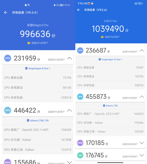 我們選擇了(le)國内普遍使用(yòng)的(de)跑分(fēn)軟件安兔兔作爲統一的(de)測試平台,其中小米12Pro安兔兔跑分(fēn)成績爲1020596,榮耀Magic4Pro的(de)跑分(fēn)成績爲996636,一加10Pro跑分(fēn)成績爲1025509,iQOO9Pro的(de)成績爲1015670。四款手機的(de)跑分(fēn)成績均表現不俗,可(kě)以看出在綜合性能上幾款手機都達到了(le)頂級安卓旗艦标準,也(yě)超過了(le)市場(chǎng)上的(de)其他(tā)手機。