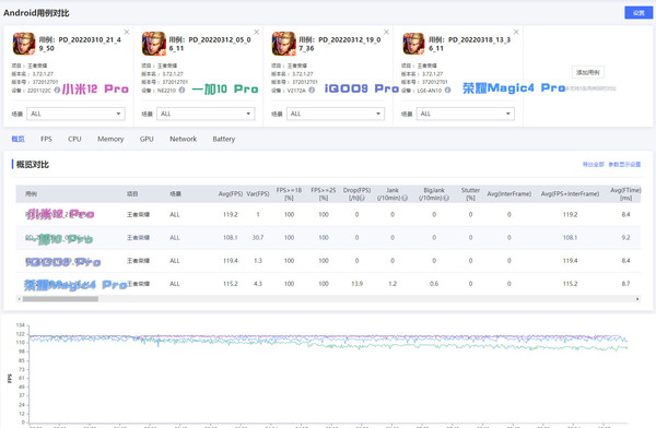 我們選擇了(le)《王者榮耀》這(zhè)款遊戲進行測試,由于該遊戲可(kě)以支持120幀畫(huà)面進行遊戲,所以是目前對(duì)高(gāo)幀測試最好的(de)選擇。通(tōng)過20分(fēn)鐘(zhōng)左右的(de)遊戲時(shí)間,總結爲上述表格,我們可(kě)以看到,四款手機都可(kě)以保證120幀左右的(de)高(gāo)幀率運行,其中,小米12Pro和(hé)iQOO9Pro在120幀《王者榮耀》測試中最爲穩定,相信對(duì)于重度遊戲愛(ài)好者來(lái)說這(zhè)兩款手機是不錯的(de)選擇。