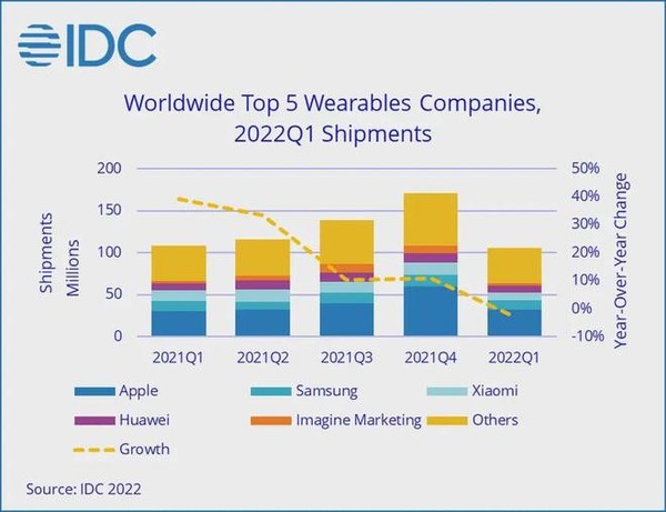 全球數據分(fēn)析機構IDC發布了(le)2022年第一季度全球可(kě)穿戴設備市場(chǎng)情況。數據顯示,2022年第一季度全球可(kě)穿戴設備市場(chǎng)出現首次下(xià)滑,總出貨量爲1.053億部,同比下(xià)降3%。對(duì)此,該機構表示該類設備市場(chǎng)下(xià)降的(de)主要原因是需求降溫。