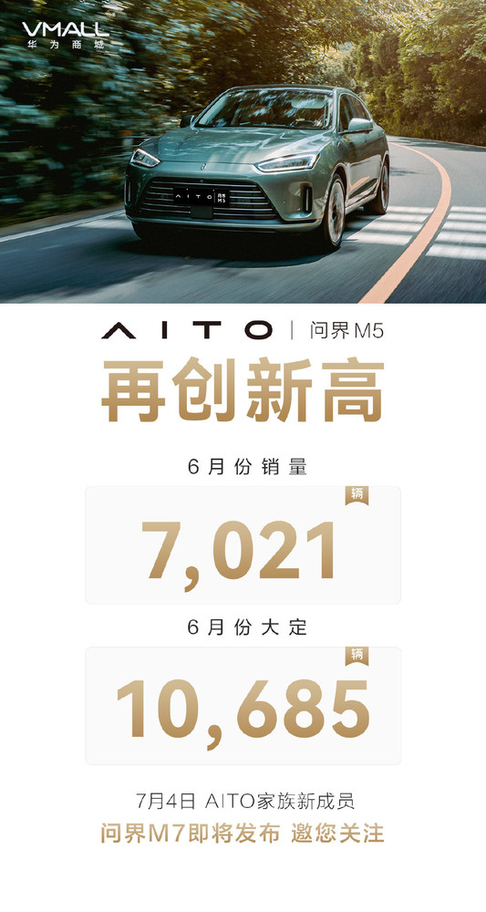 AITO問界M5再創新高(gāo) 6月(yuè)份銷量7021輛 大(dà)定10685輛