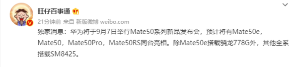 某博主在微博上發文稱,華爲将于9月(yuè)7日舉行Mate50系列新品發布會,預計将有Mate50e、Mate50、Mate50Pro以及Mate50RS多(duō)款機型發布。此外,該博主還(hái)表示,除了(le)Mate50e将搭載骁龍778G移動平台以外,其他(tā)全系将搭載SM8425(即骁龍8)芯片。值得(de)一提的(de)是,這(zhè)位博主宣稱目前暫未看到華爲Mate50X這(zhè)款機型,不知是否會有該産品。