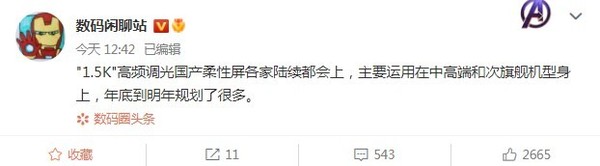 2K屏成本更高(gāo),也(yě)更加耗電,手機廠商正将注意力轉到1.5K高(gāo)頻(pín)調光(guāng)屏幕上來(lái)。8月(yuè)20日,數碼博主@數碼閑聊站表示,各大(dà)廠商将會大(dà)規模使用(yòng)1.5K高(gāo)頻(pín)調光(guāng)國産柔性屏,主要用(yòng)在中高(gāo)端和(hé)次旗艦機型身上,今年年底持續到明(míng)年都規劃了(le)很多(duō)新機。可(kě)以預見,1.5K屏可(kě)能會成爲國産手機的(de)主流。