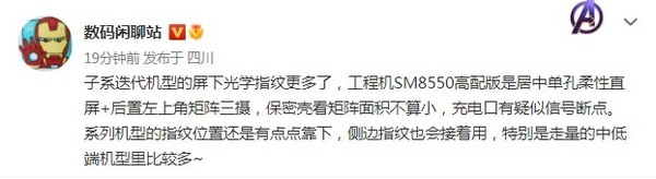 8月(yuè)19日,據數碼博主@數碼閑聊站爆料,子系叠代機型的(de)屏下(xià)光(guāng)學指紋更多(duō)了(le),工程機SM8550(即骁龍8Gen2)高(gāo)配版采用(yòng)居中單孔柔性直屏+後置左上角矩陣三攝,保密殼看矩陣面積不算(suàn)小,充電口有疑似信号斷點。從描述來(lái)看,該機可(kě)能是RedmiK60系列。上述博主還(hái)稱,系列機型的(de)指紋位置稍靠下(xià),側邊指紋也(yě)會接著(zhe)用(yòng)。