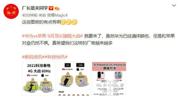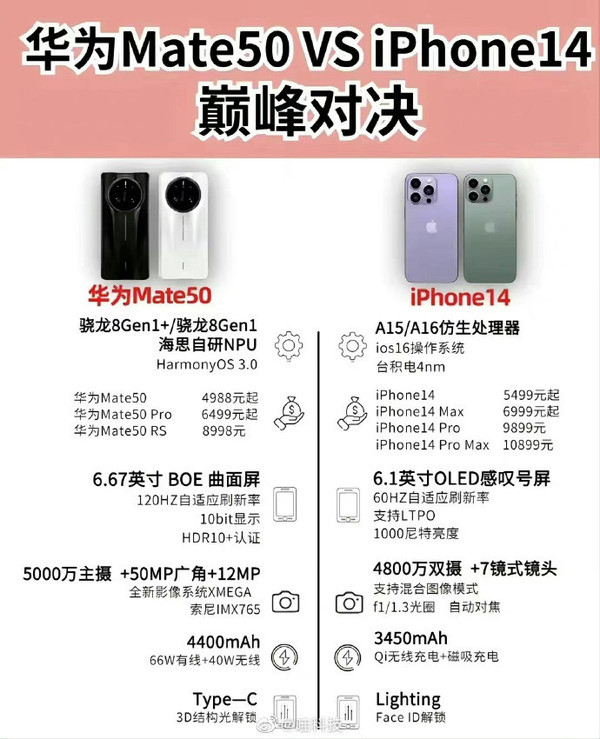 華爲Mate50系列定檔9月(yuè)6日,這(zhè)次華爲放出風聲表示要硬剛iPhone14系列。8月(yuè)31日,已經有網友根據目前的(de)爆料制作了(le)Mate50和(hé)iPhone14的(de)主要配置和(hé)價格對(duì)比圖,現在我們一起來(lái)看看。