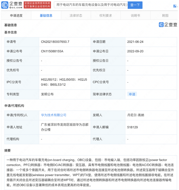 企查查顯示,2022年9月(yuè)20日,華爲技術有限公司申請的(de)“用(yòng)于電動汽車的(de)車載充電設備以及用(yòng)于對(duì)電動汽車進行無線充電的(de)系統和(hé)方法”專利公布。該專利的(de)申請日期爲2021年6月(yuè)24日,屬于發明(míng)公布專利類型。