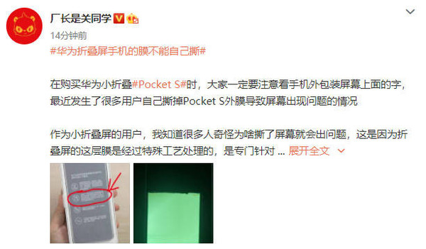 12月(yuè)8日,數碼博主@廠長(cháng)是關同學透露,華爲折疊屏手機的(de)膜不能自己撕。最近發生了(le)很多(duō)用(yòng)戶自己撕掉PocketS外膜導緻屏幕出現問題的(de)情況。因爲折疊屏的(de)這(zhè)層膜是經過特殊工藝處理(lǐ)的(de),是專門針對(duì)折疊屏來(lái)設計的(de)一層獨特保護,如果撕掉就會出現花屏、綠屏問題。想要換膜一定要去售後。