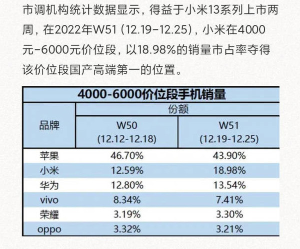 根據相關調研機構的(de)數據,在2022年W51(12月(yuè)19日到12月(yuè)25日)這(zhè)段時(shí)間内,小米在4000元到6000元的(de)價位段區(qū)間,成功地拿下(xià)了(le)18.98%的(de)市場(chǎng)份額,該成績僅次于蘋果的(de)43.9%,領先其它國産手機廠商,例如華爲(13.54%)、vivo(7.41%)、榮耀(3.30%)、OPPO(3.21%)。目前來(lái)看,小米能夠取得(de)如此亮眼的(de)成績,主要得(de)益于小米13系列的(de)發布和(hé)熱(rè)銷。