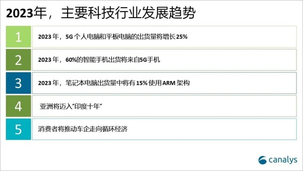 Canalys公布了(le)2023年五大(dà)主要科技行業發展趨勢,分(fēn)别是5G個(gè)人(rén)電腦(nǎo)和(hé)平闆電腦(nǎo)的(de)出貨量将增長(cháng)25%;60%的(de)智能手機出貨将來(lái)自5G手機;筆記本電腦(nǎo)出貨量中将有15%使用(yòng)ARM架構;亞洲将邁入“印度十年”;消費者将推動車企走向循環經濟。
