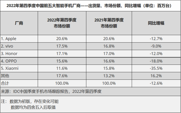 1月(yuè)29日,數據公司IDC公布了(le)2022年第四季度以及全年智能手機出貨量數據。數據顯示,2022年第四季度中國智能手機市場(chǎng)出貨量約7292萬台,同比下(xià)降12.6%。2022年全年中國智能手機市場(chǎng)出貨量約2.86億台,同比下(xià)降13.2%。時(shí)隔10年,中國智能手機市場(chǎng)出貨量再次回落到3億以下(xià)市場(chǎng)大(dà)盤。