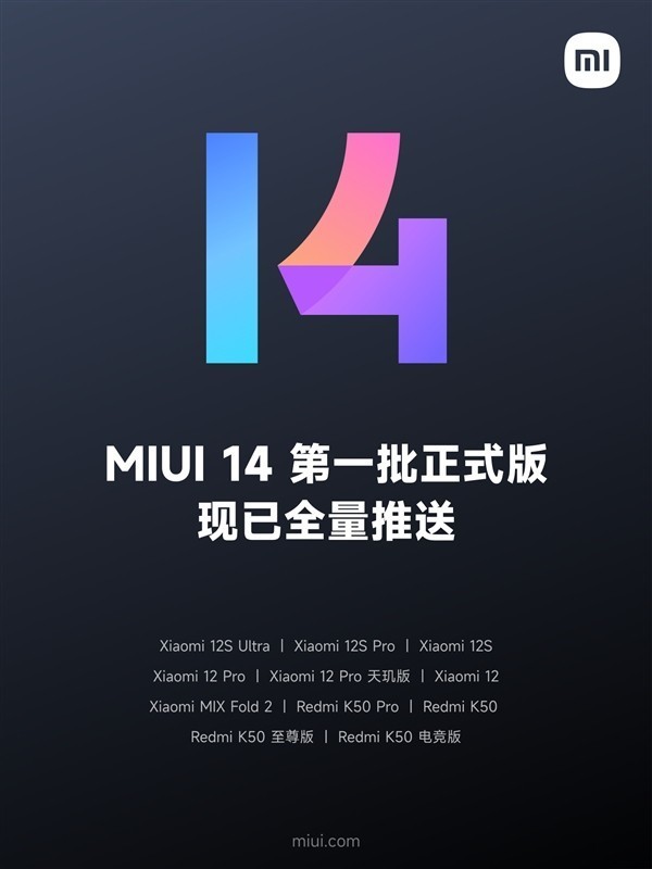 首批推送的(de)機型共有11款,包括Xiaomi 12S Ultra、Xiaomi 12S Pro、Xiaomi 12S、Xiaomi 12 Pro、Xiaomi 12 Pro天玑版、Xiaomi 12、Xiaomi MIX Fold 2、Redmi K50 Pro、Redmi K50、Redmi K50至尊版、Redmi K50電競版。