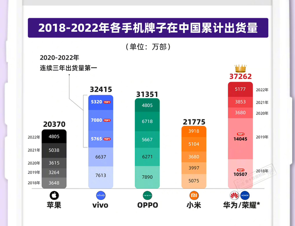 根據《金十數據》的(de)統計,總體來(lái)看,過去五年内中國市場(chǎng)賣出了(le)超過17億部智能手機,而其中銷量最高(gāo)的(de)手機品牌是華爲+榮耀,總計賣出了(le)超過3.7億部智能手機。需要注意的(de)是,目前榮耀已經在2021年正式獨立,需要和(hé)華爲分(fēn)開看待,但是該統計囊括了(le)很長(cháng)一段榮耀并未獨立的(de)時(shí)間段。