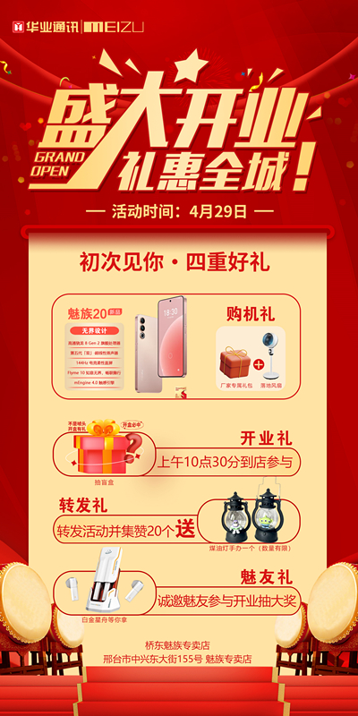 華業通(tōng)訊|4月(yuè)29日魅族專賣店(diàn)盛大(dà)開業!禮惠全城(chéng)!魅友,歡迎回家!