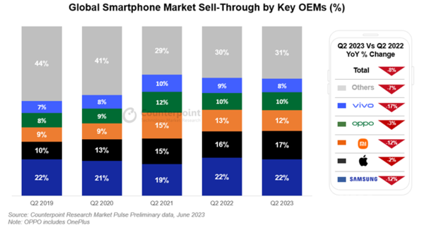 根據Counterpoint發布的(de)最新報告,2023年第二季度全球智能手機市場(chǎng)銷量同比下(xià)降8%,環比下(xià)降5%。這(zhè)是連續第八個(gè)季度同比下(xià)降。