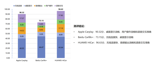 此次,ICCE從連接、音(yīn)頻(pín)、視頻(pín)、操控和(hé)交互場(chǎng)景五大(dà)維度入手,針對(duì)Apple Carplay、Baidu Carlife+、HUAWEI HiCar等主流手機-汽車互聯方案,随機選取6款車進行了(le)測評。從報告結果來(lái)看,大(dà)多(duō)數手機-汽車互聯方案體驗可(kě)達到85分(fēn)以上,能較好滿足用(yòng)戶需求;其中HUAWEI HiCar獲得(de)96.63分(fēn),在所有測評方案中獲得(de)第一名,其在無線連接、音(yīn)頻(pín)輸出和(hé)語音(yīn)交互這(zhè)三個(gè)方面擁有突出優勢。