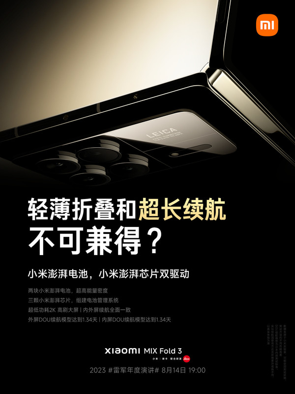 小米MIX Fold3有三顆自研澎湃芯片加持 續航可(kě)達1.34天!