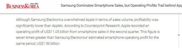 外媒:三星手機銷量全球第一但利潤隻有蘋果七分(fēn)之一