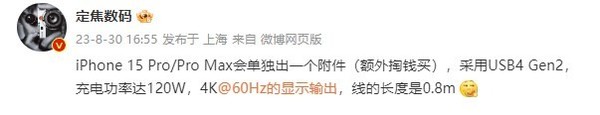 8月(yuè)30日,有數碼博主爆料稱,iPhone 15 Pro/Pro Max會單獨出一個(gè)附件(額外掏錢買),其采用(yòng)USB 4 Gen2,充電功率達120W,線的(de)長(cháng)度是0.8m。