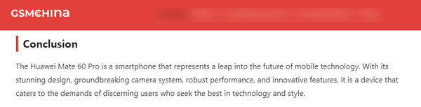 最後,外媒總結稱,華爲Mate60 Pro是一款代表著(zhe)移動技術未來(lái)的(de)飛(fēi)躍的(de)智能手機。憑借令人(rén)驚歎的(de)設計、突破性的(de)相機系統、強大(dà)的(de)性能和(hé)創新的(de)功能,Mate60 Pro是一款足以滿足追求最佳技術和(hé)風格的(de)挑剔用(yòng)戶的(de)需求。