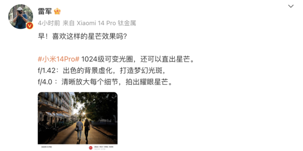 29日一早,雷軍就在微博詢問網友喜歡這(zhè)樣的(de)星芒效果嗎?并表示該光(guāng)圈可(kě)直出星芒效果,并且在f/1.42時(shí)背景虛化(huà)效果更明(míng)顯,在f/4.0時(shí)成像更爲清晰銳利。