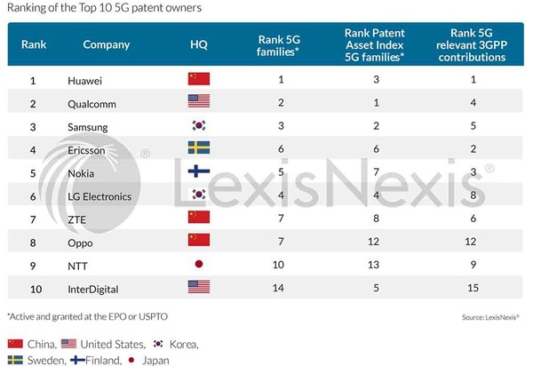 根據LexisNexis IPlytics編制的(de)專利指數,華爲5G專利總數排名第一。高(gāo)通(tōng)公司位居第二,三星排名第三。愛(ài)立信、諾基亞和(hé)LG電子,分(fēn)别位列第四、第五和(hé)第六名。中興通(tōng)訊、OPPO、NTT和(hé)InterDigital緊随其後。
