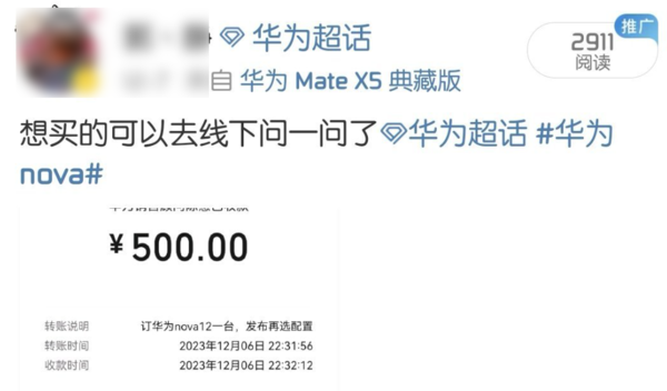 近日,有博主曬出聊天記錄截圖,一名網友表示,他(tā)那的(de)華爲智慧生活體驗館發消息稱,“可(kě)以預定華爲nova 12了(le)”。手機中國在評論區(qū)發現,還(hái)有另外一名網友曬出了(le)預訂華爲nova 12的(de)付款截圖。圖片顯示,轉賬金額爲500元,轉賬說明(míng)爲“訂華爲nova 12一台,發布再選配置”,轉賬時(shí)間則爲12月(yuè)6日。也(yě)就是說,不少華爲的(de)線下(xià)門店(diàn)早就開啓了(le)nova 12的(de)線下(xià)預訂。如果大(dà)家對(duì)新機感興趣,可(kě)以去線下(xià)門店(diàn)碰碰運氣。